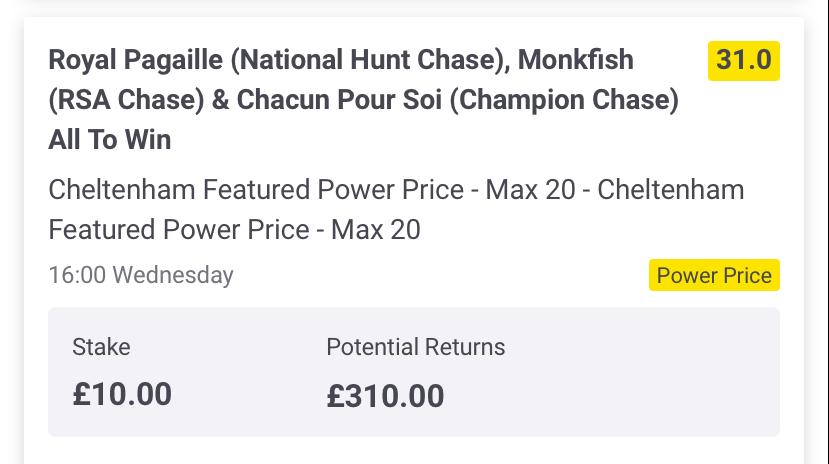 A few of the bets use the ‘to win any race at Cheltenham’ market and this means it doesn’t matter what races the horses end up entered in, as long as they win at the Festival, that leg of the bet is a winning one.