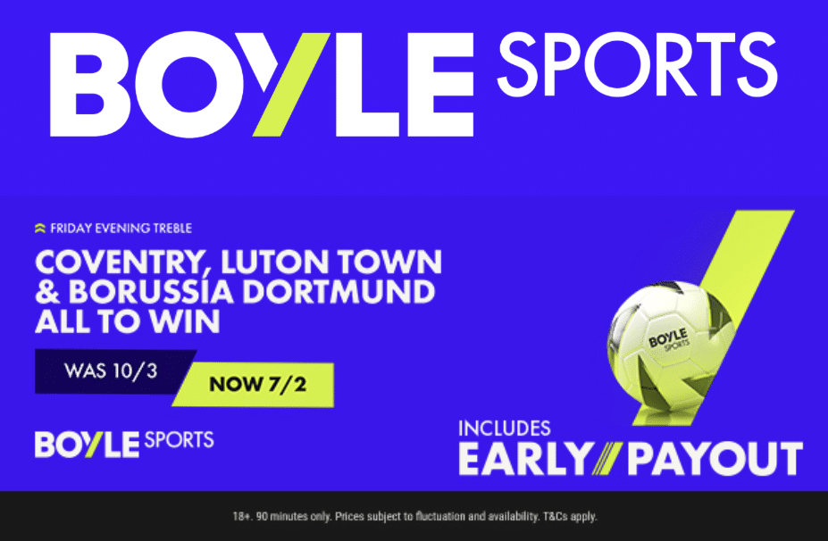 The BoyleSports price boost for Friday night is Coventry, Luton, and Borussia Dortmund all to win, and it has been boosted from 10/3 to 7/2.