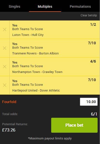 Both teams have scored in the last four games played by Hull and they now visit a Luton team more than capable of finding the net. That Championship clash features in this Saturday BTTS Accumulator alongside Tranmere’s League One game against Burton with each team netting twice in midweek. A game in League Two is also covered with Northampton and Crawley scoring consistently this season while goals are often scored in Hartlepool home matches with their fixture against Dover providing the final selection.