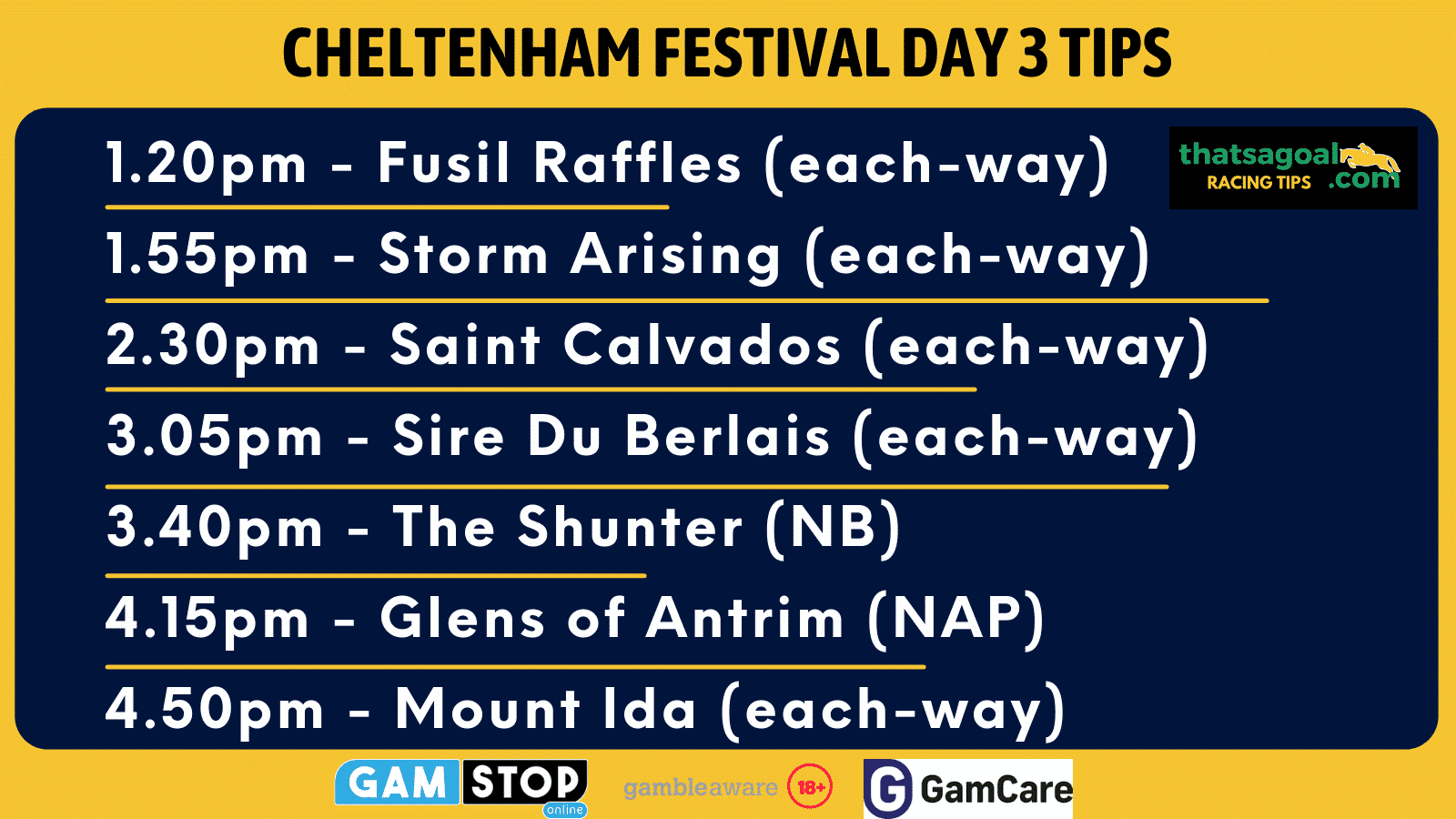 The finale on Day 3 is the Kim Muir, a handicap ran over 3m2f. Again it’s disappointing that no amateur riders can take part this year as this is a race they love but nevertheless it’s still a very decent and wide open betting heat for us punters to get stuck into. The one I like in this is the mare MOUNT IDA EW (10/1 with bet365) for the Sneezy Foster team. Mount Ida has been running really solid races all season, never finishing out the frame in Graded Chase contests. She now returns to handicap company and I think she’ll relish this step up in trip to 3m2f. We know the yard like to target the handicaps at the Festival and I’m sure this has been the plan now for a while. Another great each way bet to round off proceedings on Day 3.Cheltenham Day Best Sign-up Offer