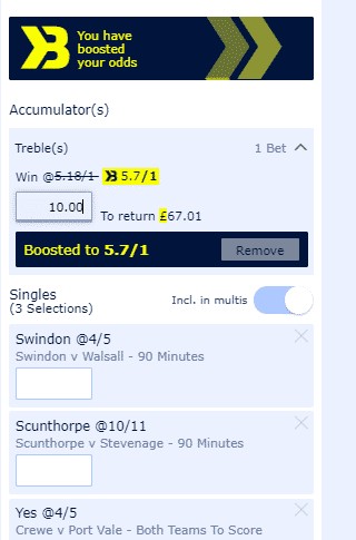 Anything can happen in this derby match and even though Crewe are tempting at Evens, it might be best to simply back a few goals. Crewe were thwarted by Colchester in their last home matches, but they should be able to find a way past this Vale defence. The Railwaymen are the division’s joint-highest scorers with 26 goals so far and last week’s blank looks like it could just be a blip. They have only kept two clean sheets this season at Gresty Road and that will be a concern for Dave Artell. Vale are much weaker away from home although they’ve only lost one of their last three outside of Burslem. They netted twice against Bradford, scored three times at Brisbane Road and twice at Blundell Park. Only Exeter and Newport have kept them off the scoresheet so far and they should be able to trouble Crewe’s back-line in this one.BET NOW – £10 wins £167 if all three results come in