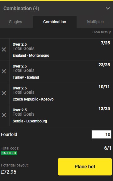 This is the shortest price of the quartet on Thursday night with plenty of goals expected at Wembley. England bounced back from an unexpected 2-1 defeat to the Czech Republic with a dominant 6-0 display against Bulgaria. The Three Lions aren’t likely to sit back here on Thursday night and should be able to register at least three times. Montenegro haven’t netted in their last four qualifiers, but they have conceded eight goals in that time and a third 3-0 defeat in five outings seems highly likely. Southgate’s men put five past this opposition on the road and they will be expected to fill their boots here.