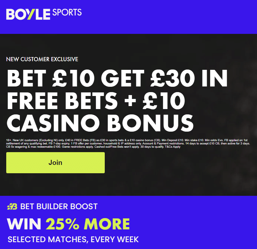 New and existing BOYLESports customers can get a 25% boost on top of any winnings from a bet builder this weekend, as well as a generous £40 sign-up offer if you have never used BoyleSports before.