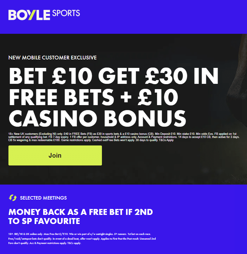 A £10 bet with the Boylesports sign-up offer returns £150, and win or lose, you get £40 in free bets for tomorrow’s racing – JOIN BOYLESPORTS.